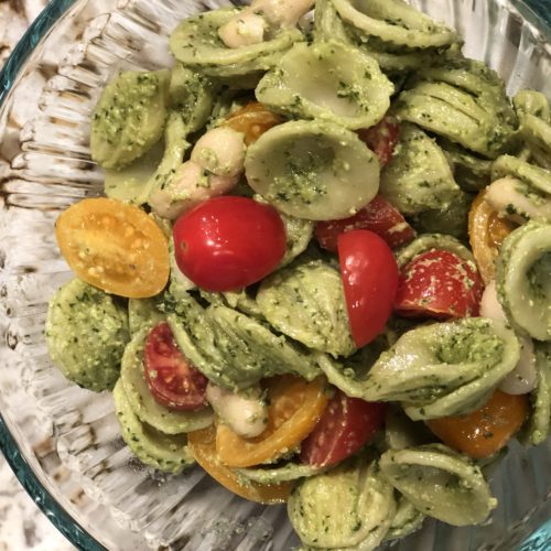 Toss this together quickly with pre-made pesto, or make your own using walnuts!